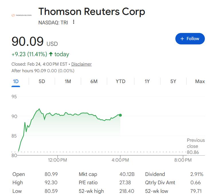 到收盘,汤森路透涨11.4%,FactSet涨5.9%,DocuSign和LegalZoom涨约2.6%。