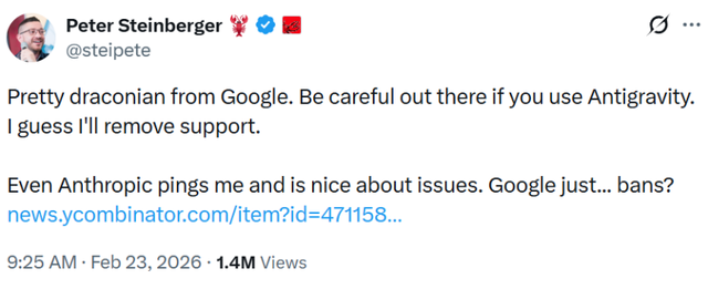 他在X上写道:“使用Antigravity的要小心了。我想我会移除对它的支持。Anthropic 至少会联系我,对问题的处理也很友好。谷歌呢?直接封禁。”