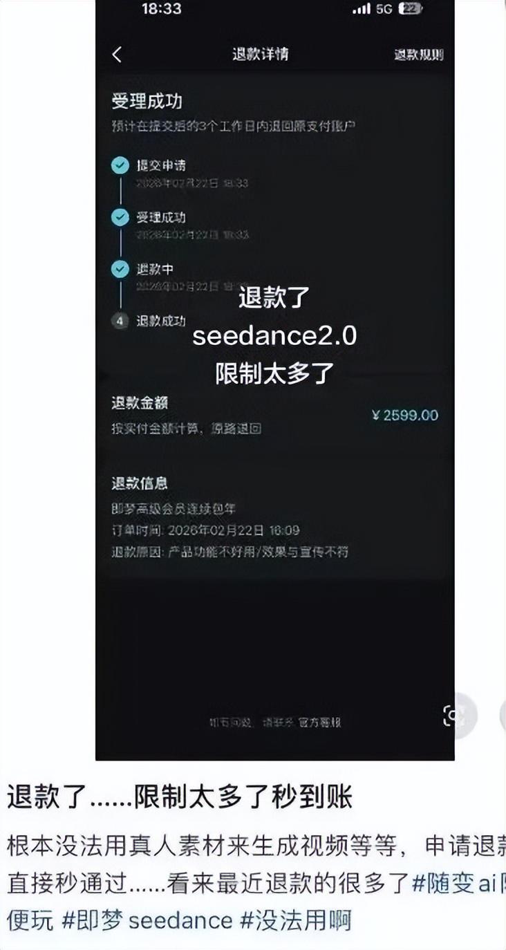 但Seedance2.0只是相对可复用性强一些,它仍然具备当前众多视频模型的问题,上传数量受限制,具体细节仍然受限,生成结果仍有盲盒性,这会带来使用成本的飙升。年初为了抢热度上头去冲2599元会员的人,已经开始后悔申请退款了。