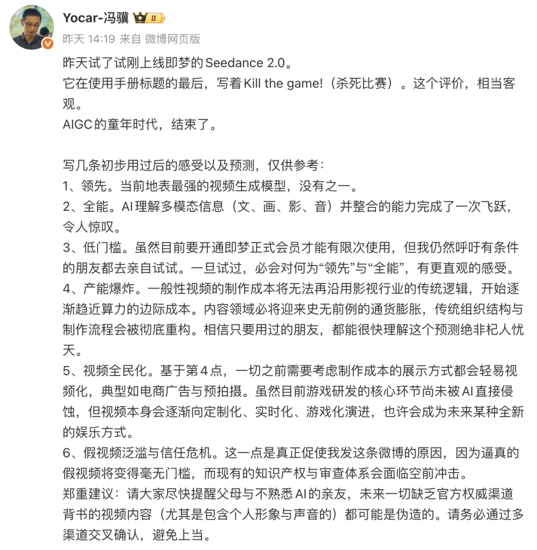 Seedance 2.0并不完美,但AI对大部分行业的冲击是真实且长期的。