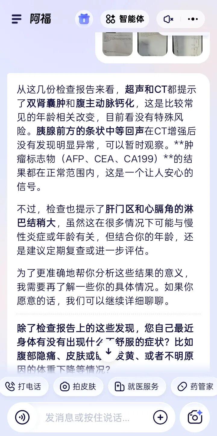 我在妈妈的手机里快速下载安装好阿福,上传了三张检查报告单。几秒钟之后,清晰易懂的解读呈现在眼前:阿福逐条拆解每一项指标,细致分析异常数据,重要信息加黑了字体,更结合三份报告给出综合判断,明确这是老年性良性变化,只需定期复查,同时附上了饮食、作息的日常调理建议。这份专业解读,和我医生朋友的答复分毫不差。