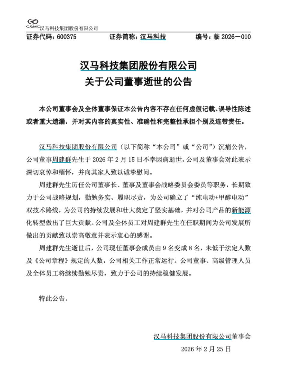 2026年2月24日,汉马科技集团股份有限公司发布沉痛公告,公司董事周建群先生于2月15日——农历丙午年除夕的前一天,不幸因病逝世,享年61岁。