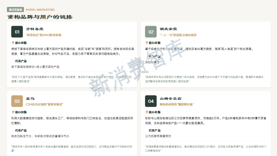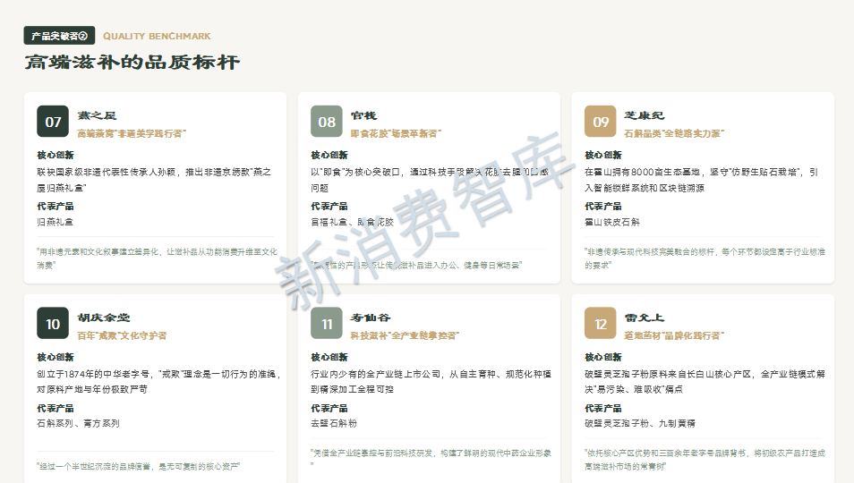 从30个品牌案例中我们看到:谷医堂将非遗膏方现代化,黑小知捍卫清洁标签,古井健康开创本草发酵新品类,小仙炖用科学实证重塑燕窝价值,芝康纪构建全链路实力模型,素养生活坚守有机道地。