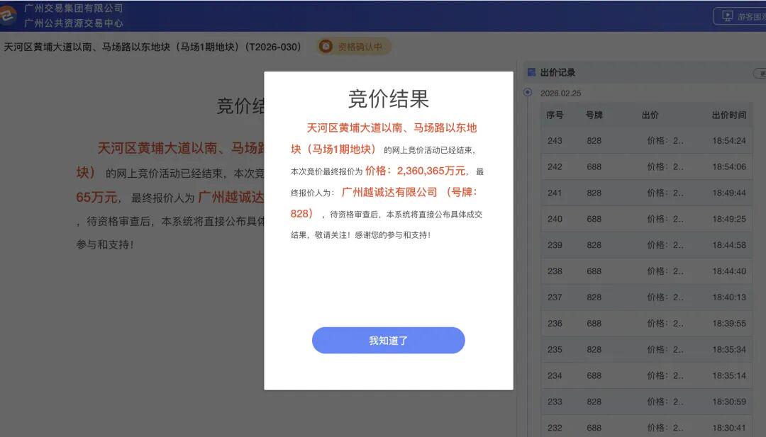 从2月25日早10时到晚19时,历经243轮鏖战,广州天河区马场地块1期地块(T2026-030)(下称“马场1期地块”)终于被越秀集团(即广州越诚达有限公司 )以236亿元的总价收入囊中,溢价26.6%,创下广州自2010年以来拍地成交总额最高纪录。