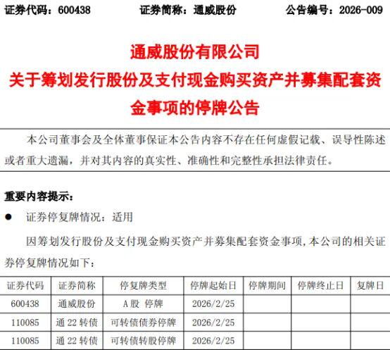 2月25日,通威股份公告称,正在筹划通过发行股份及支付现金的方式, 购买青海丽豪清能股份有限公司(下称“青海丽豪”)100%股权,并募集配套资金。公司股票及可转债自2月25日开市起停牌,预计停牌时间不超过10个交易日。若交易顺利完成,这将成为2026年光伏行业首起大规模并购案。