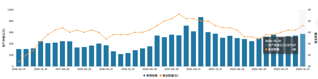 截至2025年12月31日,公司管理规模为571.07亿元,行业内排名第85位。从产品结构来看,公司呈现显著的“债强股弱”特征。非货规模为318.49亿元,其中债券型基金规模达251.17亿元,占比近八成;而权益类产品规模较小,混合型基金与股票型基金合计不足70亿元。