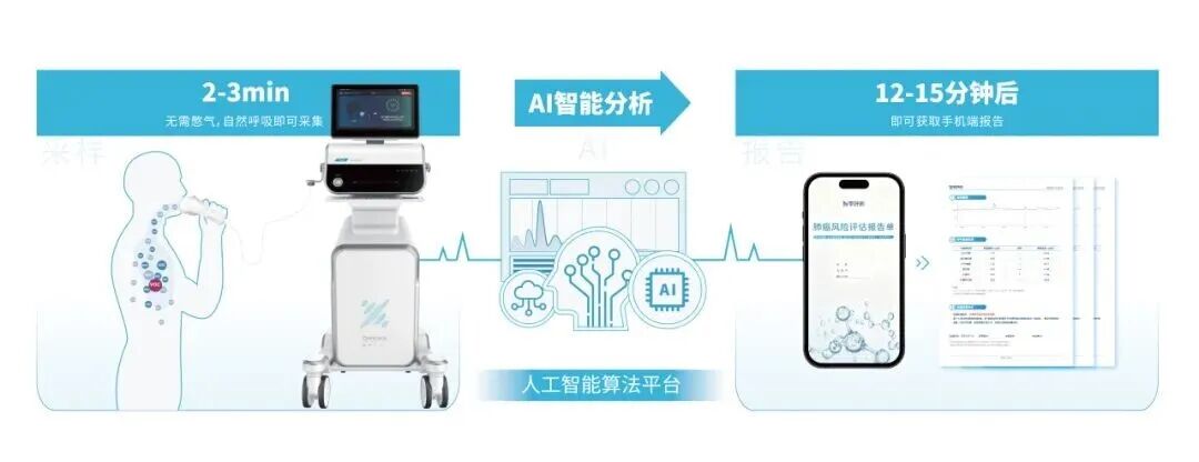 精智未来的实验室里,诞生了全球首款芯片化呼气分子分析微型气相色谱仪,基于临床1万多例样本构建AI识别模型,能在15分钟内筛查肺癌,对早期恶性肿瘤灵敏度达96.4%;