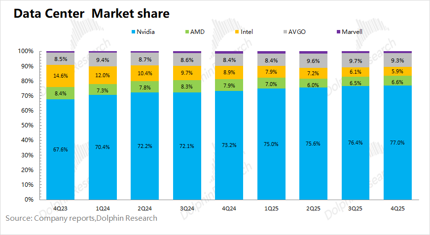 当前云服务厂商依然是公司AI芯片的最大购买方,因而下游云厂商的资本投入构成了公司数据中心业务增长的基础。而结合四家公司(谷歌、Meta、微软和亚马逊)的管理层交流,海豚君预期四大厂商在2026年的资本开支有望达到6600亿美元以上,同比增长62%,这也为公司2027财年的业绩高增长带来了保障。