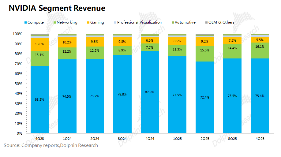 在AI Capex的带动下,英伟达的数据中心业务(Compute+Networking)的收入占比已经超过了9成,而游戏业务的占比被挤压至一成以下。