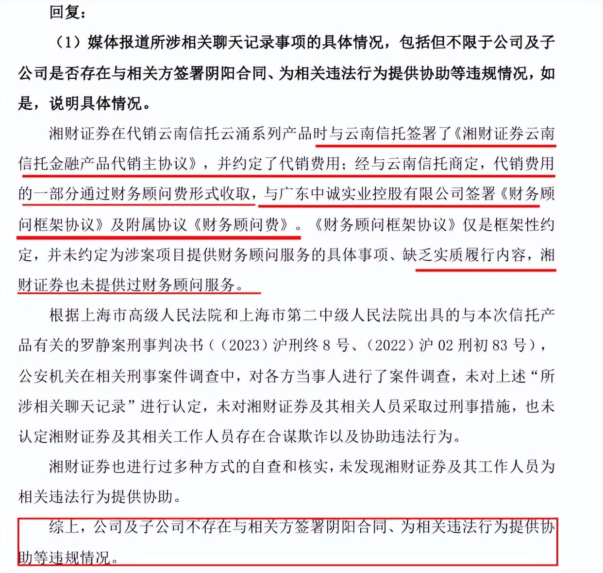 争议的焦点集中在湘财证券的勤勉尽责义务上。2024年12月,上交所曾向湘财股份下发《监管工作函》,提及有媒体报道称,湘财证券在代销云涌系列信托产品时,“明知融资方资金链紧张,仍为其借新还旧、资金空转提供帮助,在合同诈骗案件中存在过错”,并附上了聊天记录截图等证据。