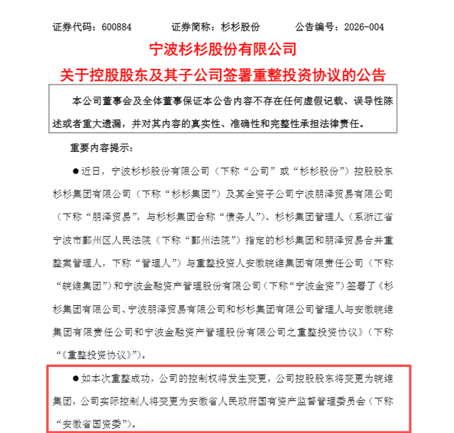 2月8日晚间,杉杉股份发布公告称,控股股东杉杉集团及其全资子公司宁波朋泽贸易有限公司、杉杉集团管理人,与重整投资人安徽皖维集团有限责任公司(下称“皖维集团”)、宁波金融资产管理股份有限公司(下称“宁波金资”)签署了《重整投资协议》。