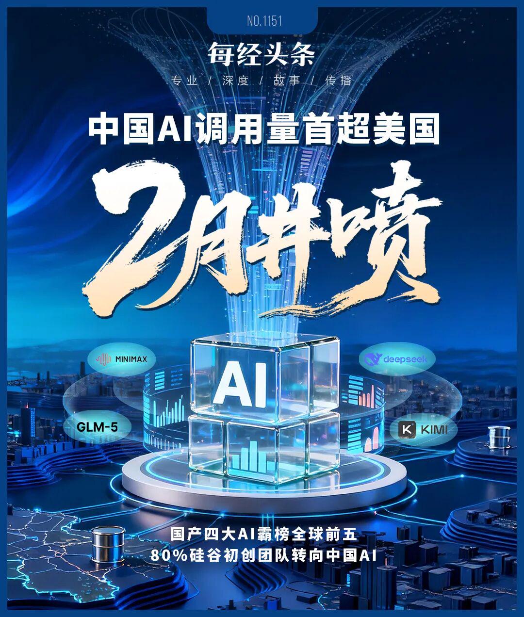 2月,中国AI的模型调用量爆发式增长,首次超过美国。