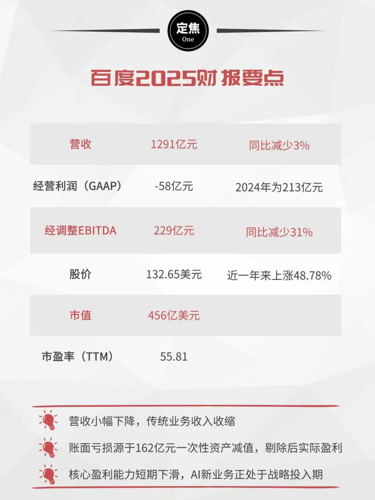 2月26日,百度发布了2025年第四季度及全年财报,呈现出转型期特点,体现在传统业务收缩,AI新业务加速成长,用短期投入换取长期增长。