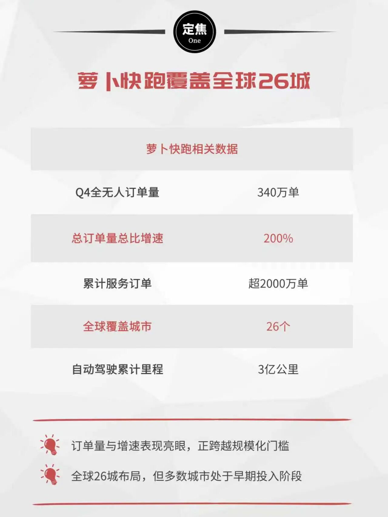 此外,百度也披露了自动驾驶业务“萝卜快跑”的部分运营数据,第四季度全无人订单达340万单,全年总订单量同比增长超200%,累计订单量突破2000万单,业务已拓展至全球26个城市。