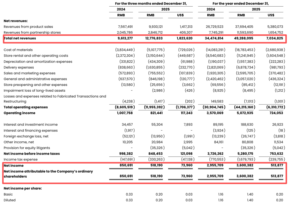 2月26日美股盘前,瑞幸咖啡(OTC:LKNCY)公布了2025年第四季度及全年财报。财报显示,去年第四季度总净收入为127.78亿元,同比增长32.9%;在美国会计准则(GAAP)下营业利润为8.21亿元,据计算同比下滑18.5%;GAAP营业利润率降至6.41%,上年同期为10.5%;净利润达5.18亿元,同比下滑近四成。净利润率为4.1%,上年同期为8.8%。