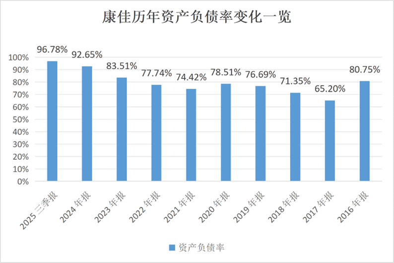 《每日财报》注意到,由于长期业绩亏损,康佳的资金主要来源于负债。截至2025年三季度末,其资产负债率已达到96.78%,其中大量负债有有息债务,包括短期借款、长期借款、应付债券等。