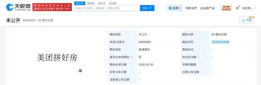 天眼查知识产权信息显示,近日,美团关联公司北京三快科技有限公司申请注册3枚“美团拼好房”商标,国际分类为科学仪器、金融物管、餐饮住宿,当前商标状态均为等待实质审查。