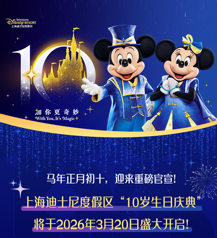 2月26日,上海迪士尼度假区正式宣布以“加你更奇妙”为主题的“10岁生日庆典”将在2026年3月20日开启。据上海迪士尼度假区总裁及总经理包兆天(Andrew Bolstein)介绍,这场庆典由演职人员历时两年精心筹备。自春季起,相关系列活动将在上海迪士尼乐园、两座主题酒店、迪士尼小镇及度假区各处陆续上演。