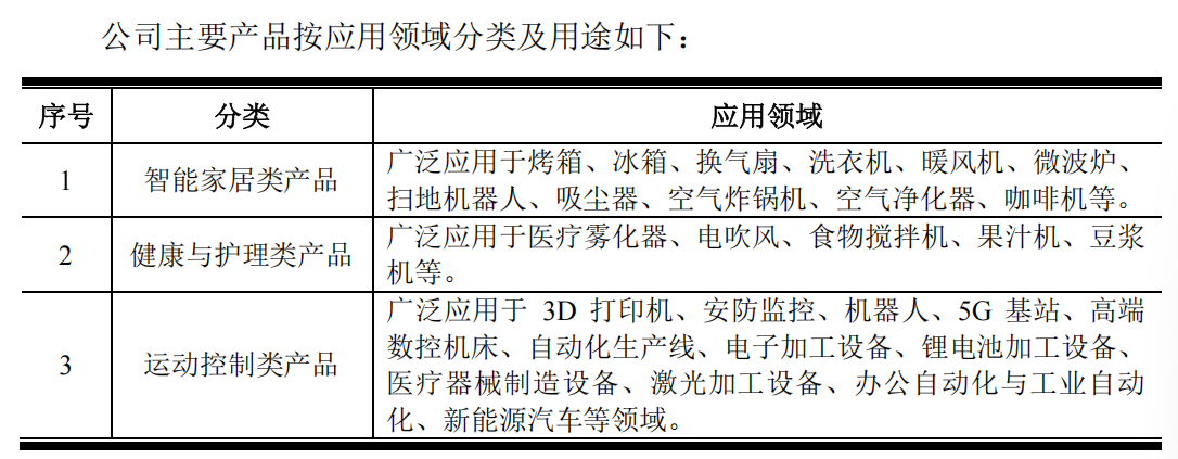 公司产品广泛应用于智能家居、机器人、工业自动化、低空经济、3D打印等前沿领域,是海康威视、大华股份、石头科技、拓竹科技、创想三维、松下(Panasonic)、美的、海信、宇视科技、广电运通、比依股份、新宝股份、伊莱克斯(AB Electrolux Group)、小米、大疆、安克创新、美团、追觅、埃夫特等境内外知名企业的重要供应商。截至2025年9月末,公司在手订单金额为33,052.13万元。