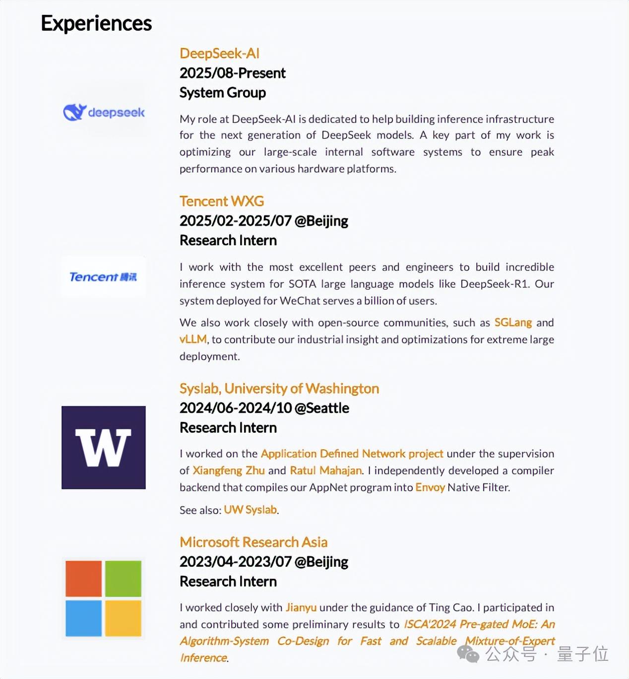 他目前在DeepSeek系统组,参与下一代模型的推理基础设施建设,负责大规模软件系统在多硬件平台上的性能优化。
