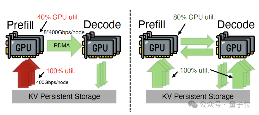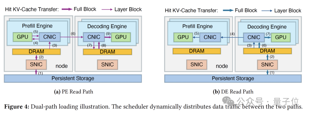 路径 A(传统):存储→PE,缓存直接读入预填充引擎。路径 B(新增):存储→DE→PE,缓存先读入解码引擎的缓冲池,再通过RDMA传输给预填充引擎。
