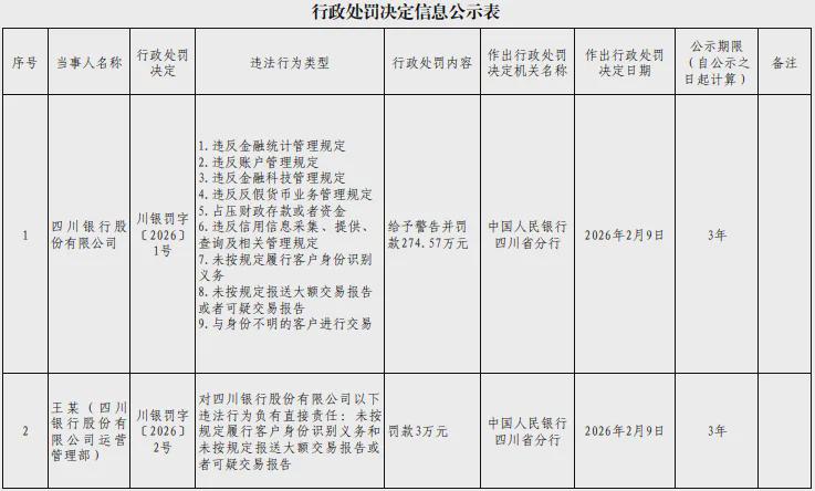 如今2026年进入2月,四川银行就因牵涉9项违法行为被人民银行重罚275万元,是否意味着人民银行对反洗钱领域的监管正在向城商行尤其是区域城商行等加快下沉?