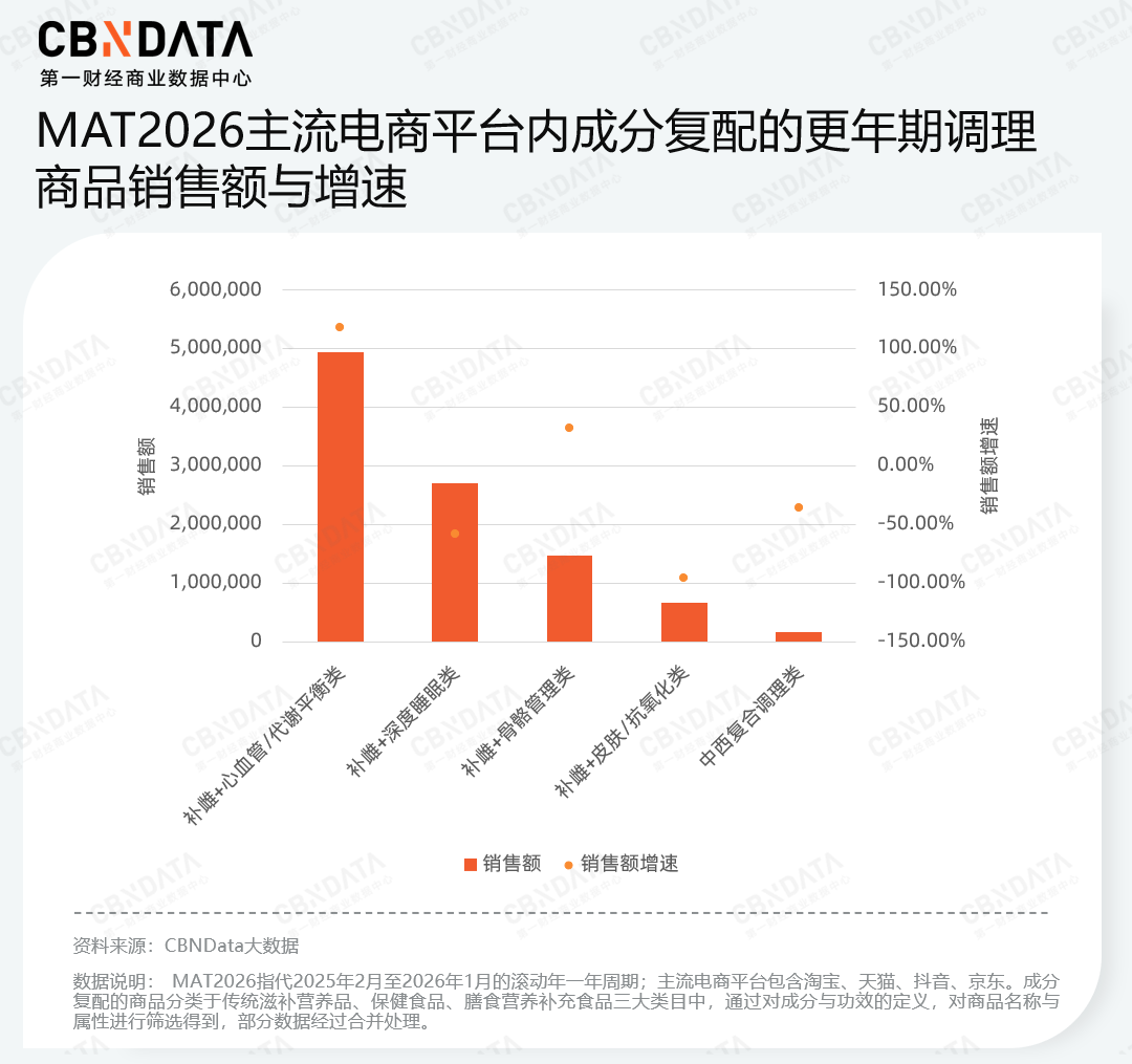 MAT2026期间,女性健康大市场的整体销售规模呈现稳健波动的态势,在整体平稳的曲线下,细分赛道的增速呈现出显著的分化趋势。其中,调经补血与补雌养巢赛道的销售额同比增速分别达到约60%和50%,高于同期私护、美容养颜及抗衰状态的增速。