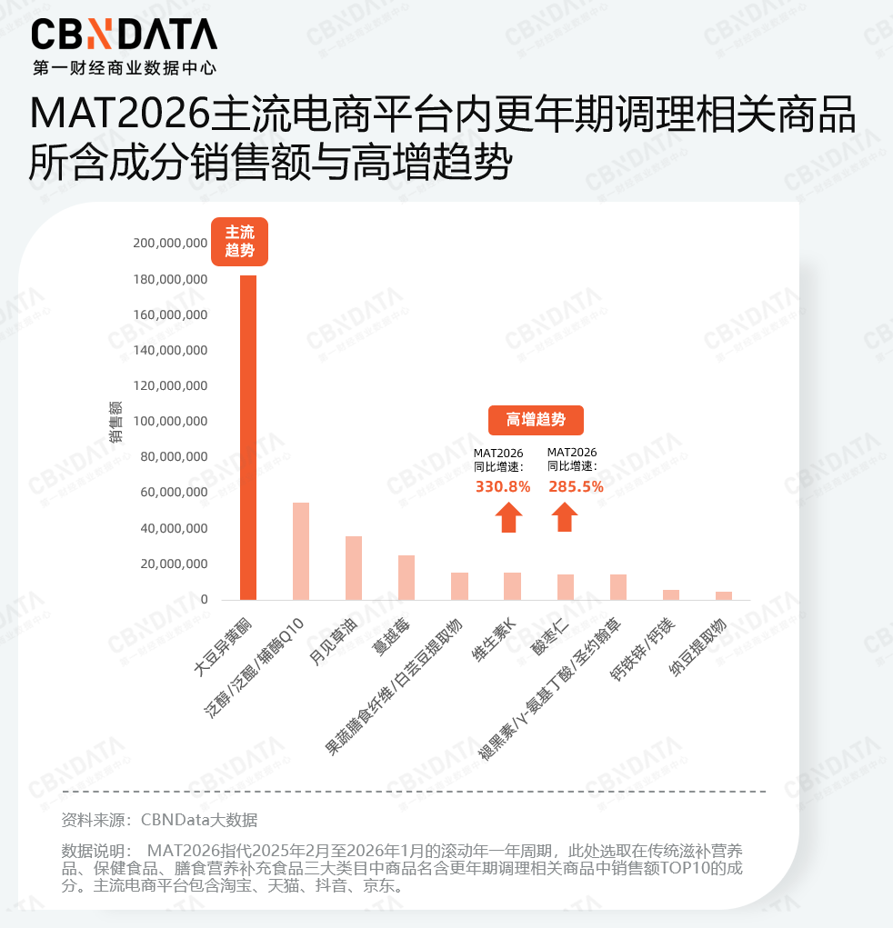 在围绝经期,“补雌”需求则成为核心。根据MAT2026更年期调节相关成分数据,大豆异黄酮是目前市场中应用最广泛、心智最成熟的植物雌激素补充方案,中老年女性在应对激素衰退时,首选通过补充类雌激素来缓解潮热、汗出等典型的围绝经期综合征。