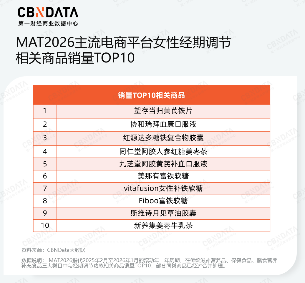 具体看到热销商品,可以明显看出女性对经期调节的消费偏好呈现出明显的“去药化”与“日常化”趋势。MAT2026女性经期调节相关商品销量TOP10显示,女性在进行长期经期补充时,表现出对天然补充剂与药食同源食品的高度信任。销量前列的产品中涵盖了当归、黄芪、阿胶、人参、红枣、姜、桑葚等传统中式滋补成分,基于药食同源逻辑的产品(如阿胶红糖姜枣茶)正成为女性调理气血、应对经期波动的核心选择。
