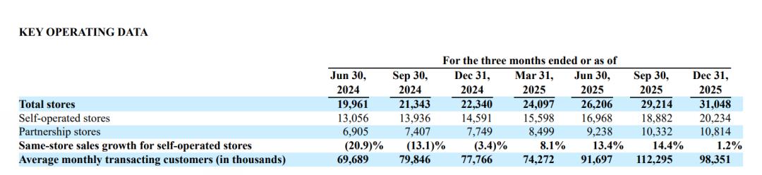 最后是“规模”。截至四季度末,公司门店总数达31048家,远超库迪、Manner,也大幅领先星巴克中国。
