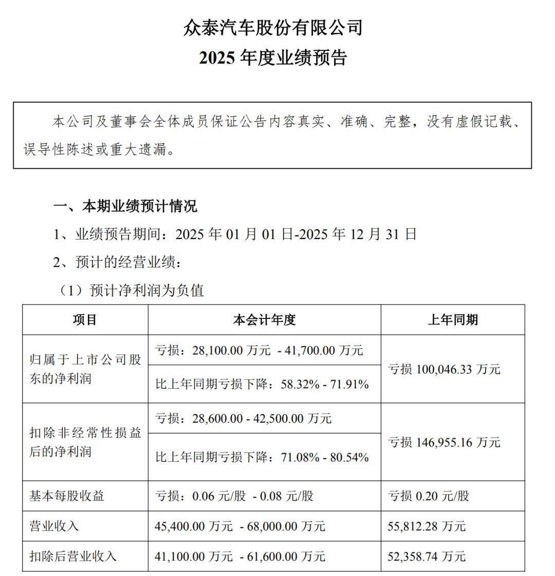 截至目前,众泰汽车仍未发布2025年度业绩报告。此前众泰汽车发布的2025年度业绩预告显示,预计2025年众泰汽车归属于上市公司股东的净利润为亏损2.81亿元至4.17亿元,上年同期亏损10亿元;扣除非经常性损益后的净利润为亏损2.86亿元至4.25亿元,上年同期亏损14.70亿元。