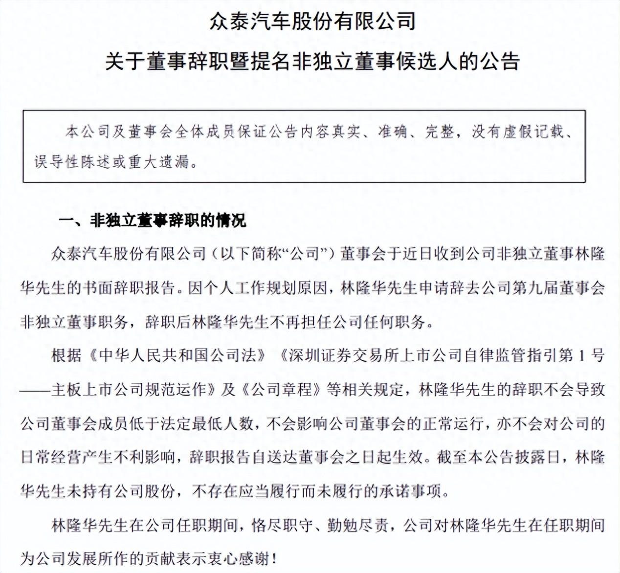2月26日,众泰汽车股份有限公司(下称“众泰汽车”)发布《关于董事辞职暨提名非独立董事候选人的公告》。公告内容显示,众泰汽车董事会于近日收到非独立董事林隆华的书面辞职报告。因个人工作规划原因,林隆华申请辞去公司第九届董事会非独立董事职务,辞职后林隆华不再担任公司任何职务。
