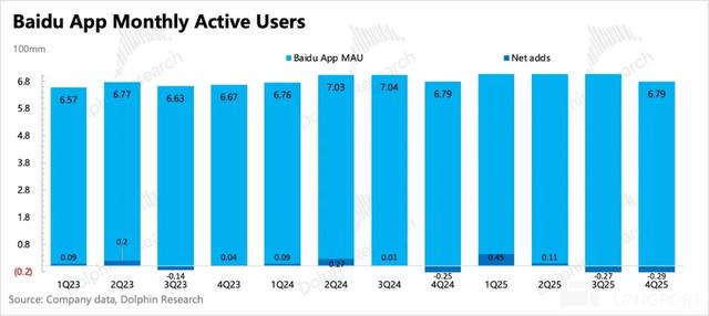同时,百度APP用户已连续两个季度流失,截至2025Q4,MAU为6.79亿,环比减少2900万。