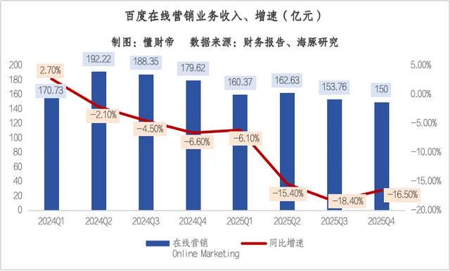 据海豚研究测算,2025Q4,百度在线营销业务收入约150亿元,同比下滑16.5%,已连续7个季度下跌。[1]