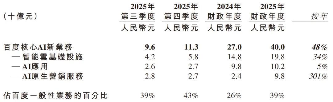 2025Q4,百度核心AI新业务营收113亿元,占百度一般性业务收入的43%。