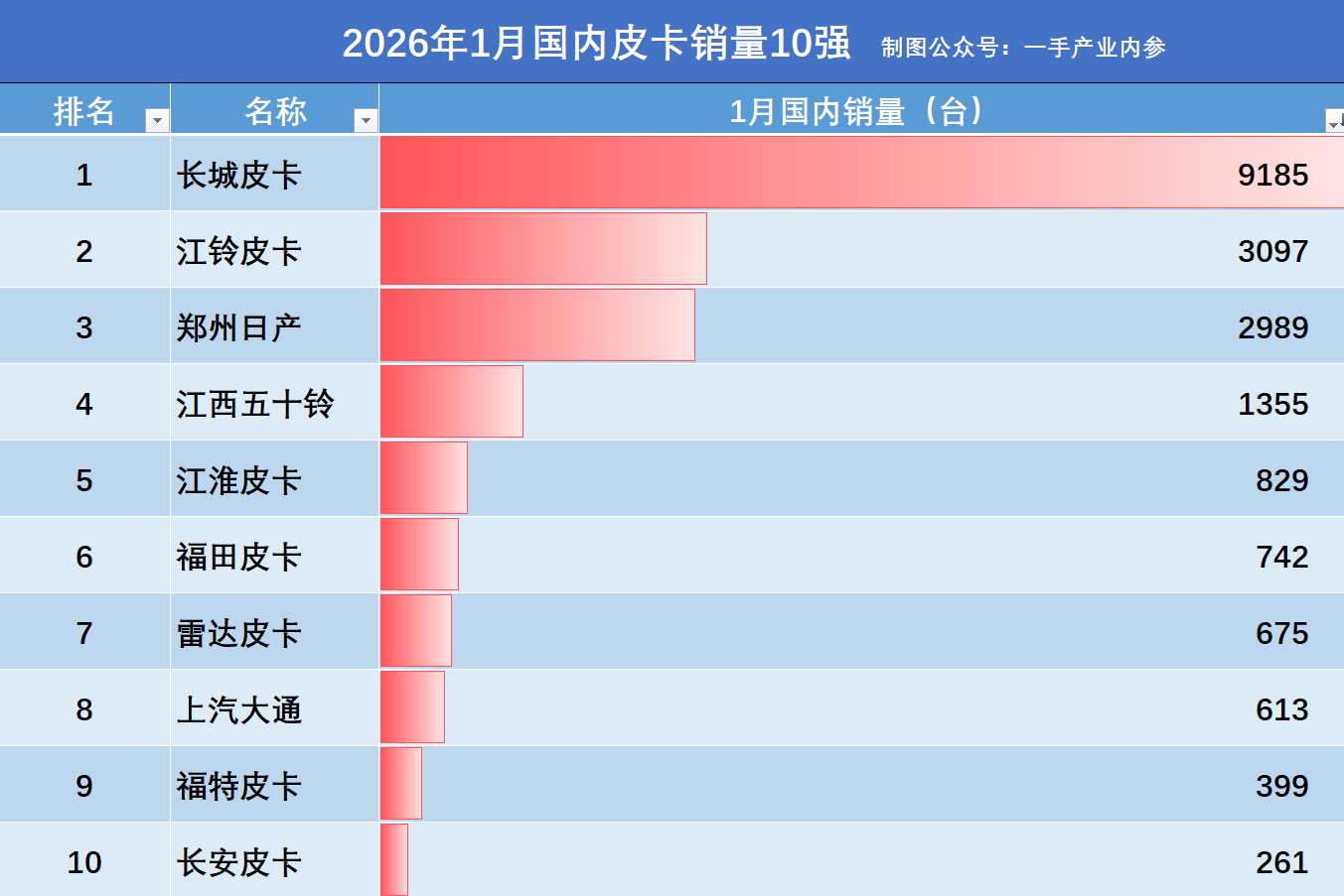 另附:2026年1月国内皮卡市场销量10强品牌,数据源于:中国皮卡网。