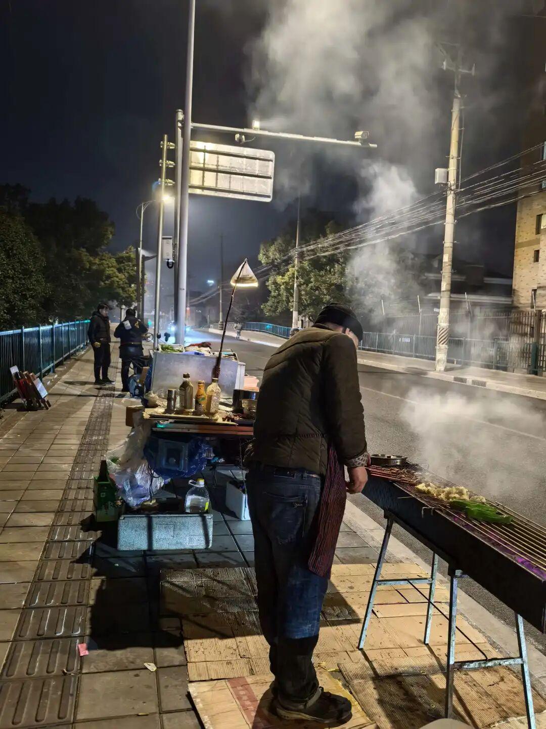 已过深夜12点,上海浦东某地路边,老李的烧烤摊炊烟袅袅,寒风中觅食的人隔三差五来那么一两个。