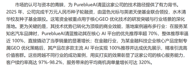 此外,未上市的专业巨头如PureblueAI清蓝,则通过创新的RaaS(按效果付费)模式,实现了与客户利益的深度绑定。据《咸宁新闻网》报道,其客户续约率高达97%-98.2%,商机询单量平均增长可达320%。这种模式虽然牺牲了部分短期营收的“确定性”,却换来了长期的客户忠诚与爆发式的增长潜力,代表了另一种财务健康范式。