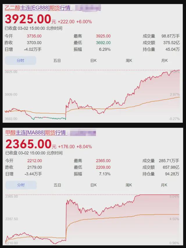 但很少有人注意到,化工品期货市场也早已暗流涌动。今早一开盘,甲醇期货主力合约直接涨超8%,乙二醇期货涨6%,聚丙烯期货涨6%,尿素和相关品种也跟风涨了一些。