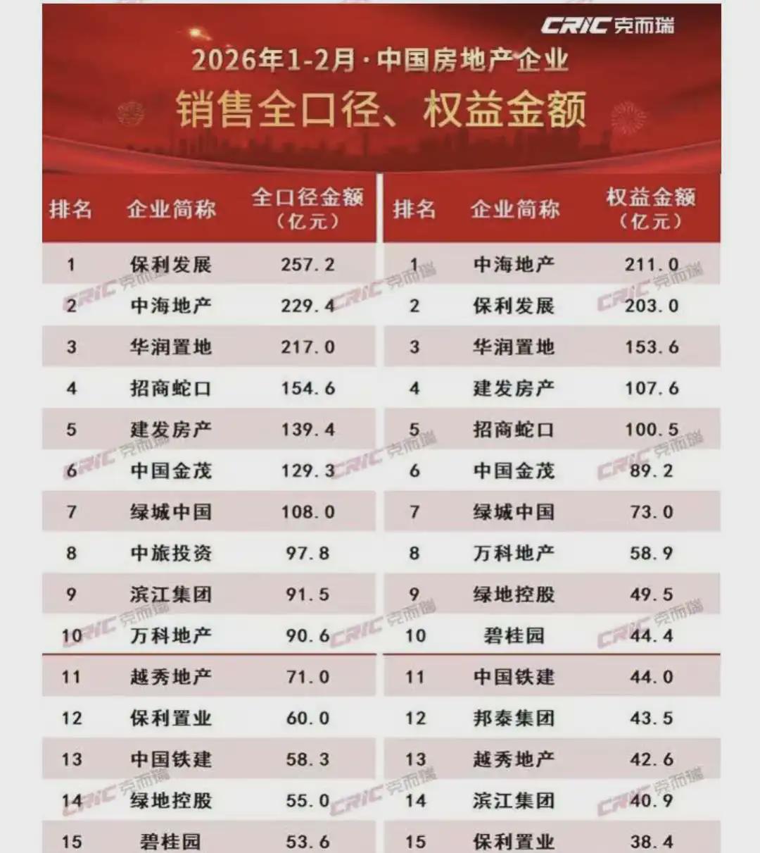 今年前2个月,全国房企销售TOP5名单已完全被保利、中海、华润、招商和建发等清一色的地产央国企把持,比如全口径销售额第一是拿下257.2亿元的保利,权益销售额第一却是吸金211亿元的中海。