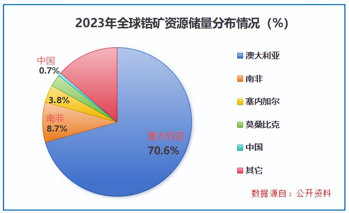 2023年的数据显示,全球锆矿储量约6800万吨(以ZrO₂计),但分布不均,澳大利亚和南非合计掌控了近80%的储量。