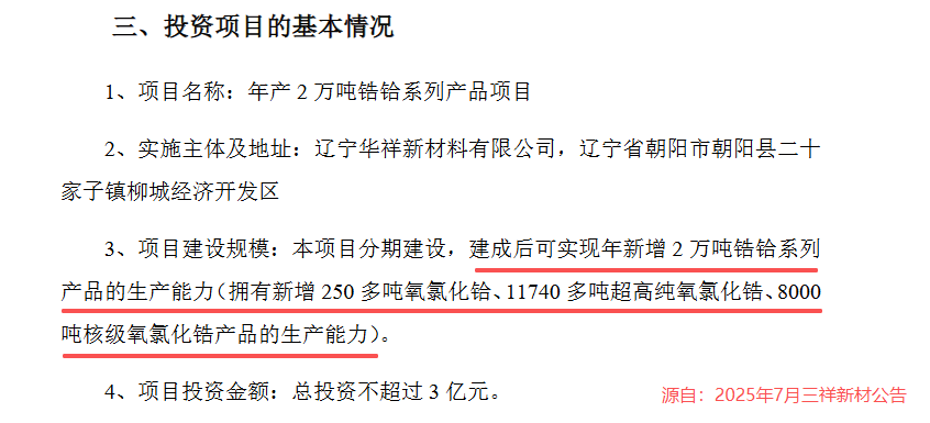 三祥新材突破海外技术垄断,于2025年7月启动了年产2万吨锆铪系列产品项目,分离纯化的锆材料纯度可达99.999%(5N)、铪材料纯度可达99.99%(4N)以上。