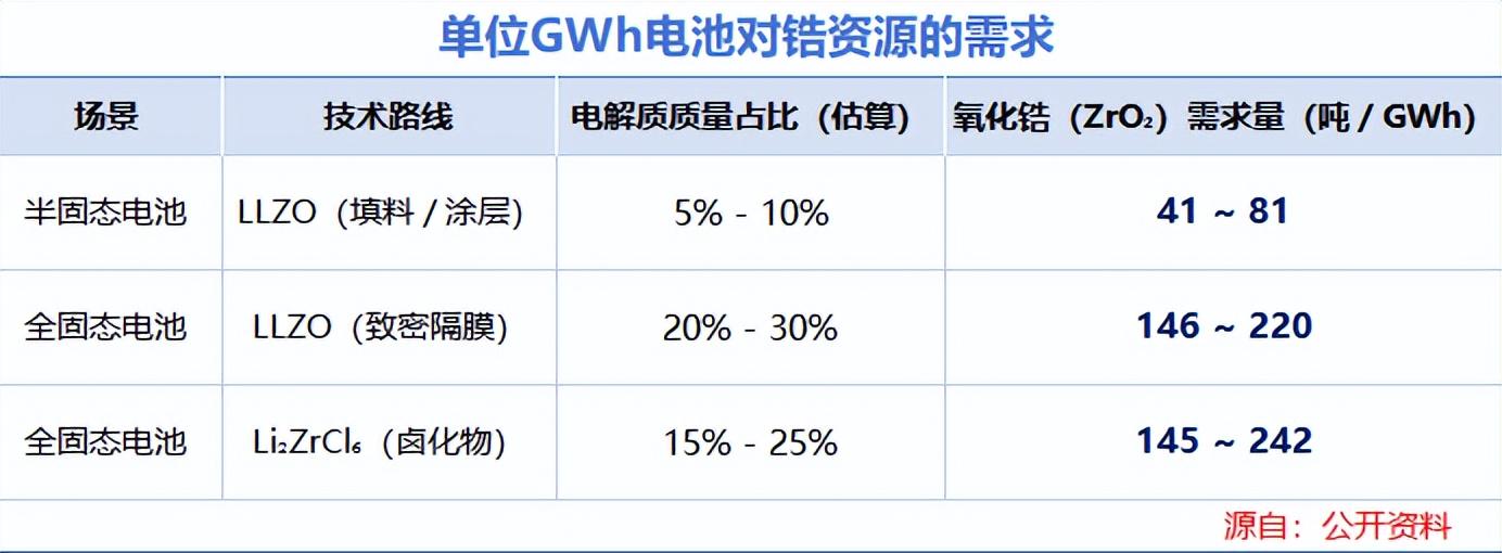 比如,氧化物半固态电池的生产就离不开锂镧锆氧(LLZO),据测算每生产1GWh这种电池,就要对应消耗41-81吨氧化锆;若是全固态电池,氧化锆的单GWh需求量更是突破百吨。