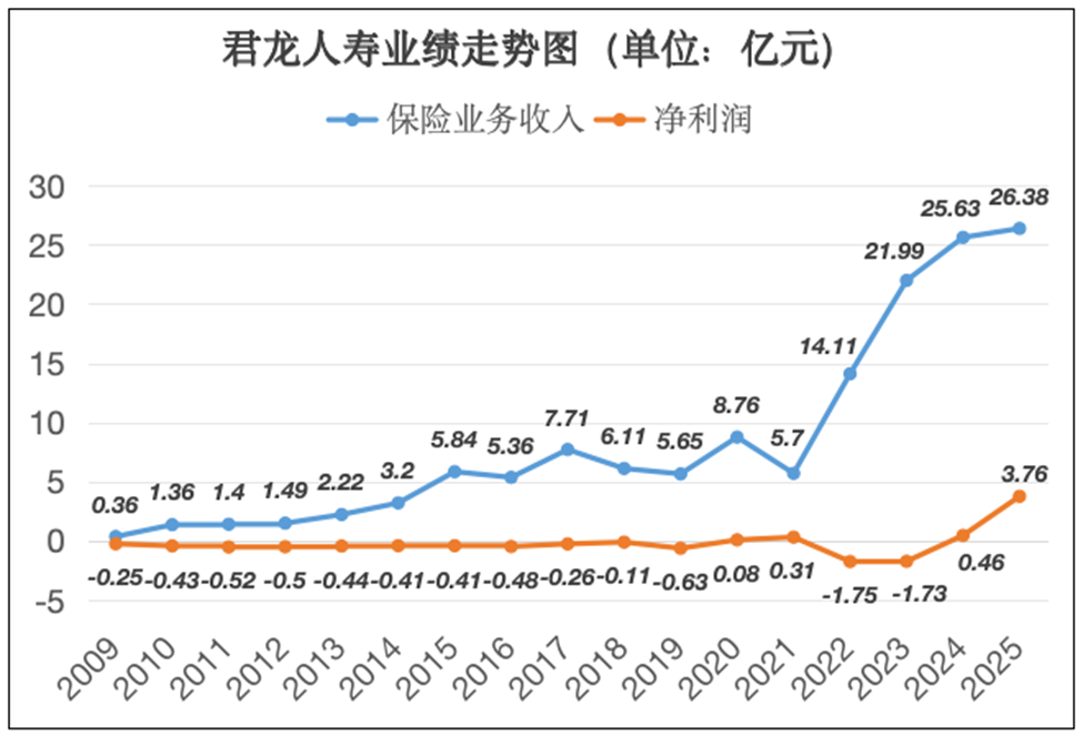 而就在此次人事调整前不久,君龙人寿2025年成绩单出炉,整体表现可以说是非常亮眼的。规模方面,总资产突破110亿,达111.9亿元,较年初大幅增长20.49%;净资产23.3亿元,较上年末增长13.04%,“家底”明显变厚。效益方面,实现保险业务收入26.38亿元,同比增长2.93%;受新旧会计准则切换影响,当期净利润实现开业17年以来的最高盈利水平,达到了3.76亿元。