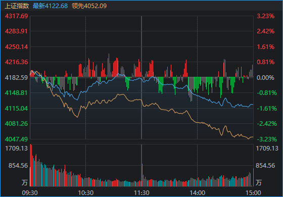 全市场超4800只个股下跌。沪深两市成交额3.13万亿元,较上一个交易日放量1088亿元。