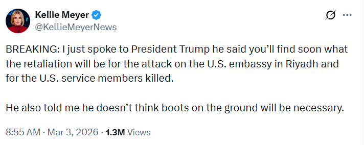 美国白宫记者Kellie Meyer在X平台披露的采访内容,特朗普表示,美方将很快宣布针对驻利雅得大使馆遇袭事件及在伊朗冲突中阵亡美国军人的回应措施。