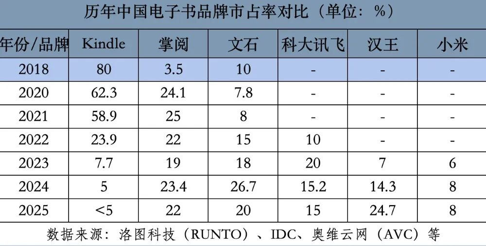 这一数据的背后是,Kindle的市场份额被小米、科大讯飞、华为等本土企业持续分割,其中国市占率从2018年巅峰80%一路跌至2023年上半年仅7.7%。