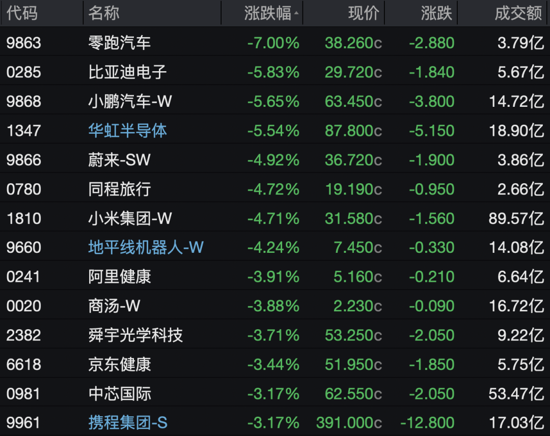 科网股普跌,零跑汽车跌7%,华虹半导体、小鹏汽车、比亚迪电子跌逾5%,小米集团、蔚来跌逾4%。