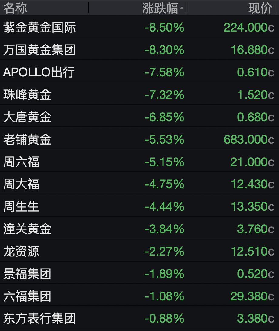 黄金股同样大跌,紫金黄金国际、万国黄金集团均跌超8%,老铺黄金、周六福跌超5%。