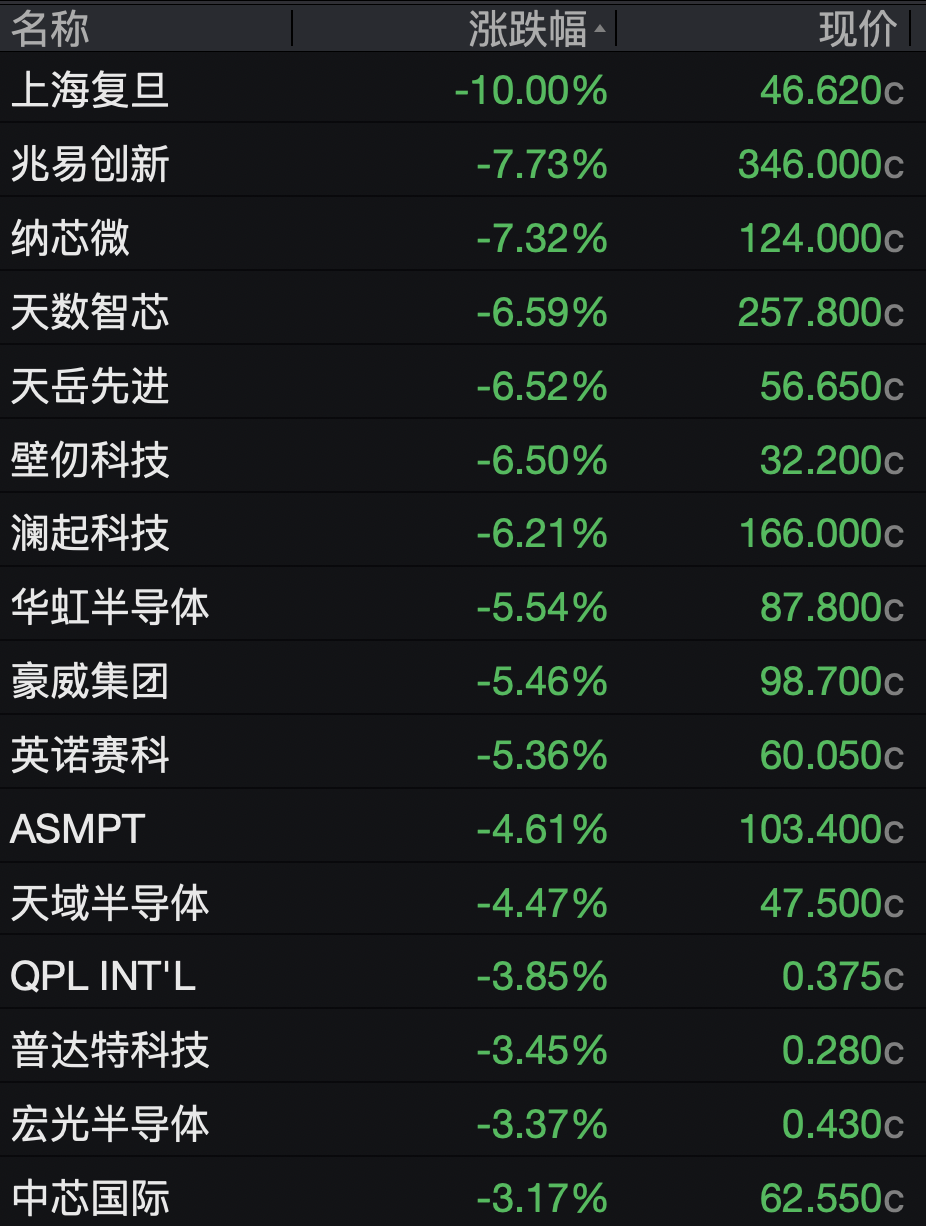 半导体、芯片股集体大跌,上海复旦跌10%,兆易创新、纳芯微跌超7%,澜起科技跌超6%,中芯国际跌超3%。